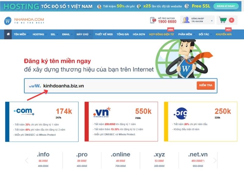 Bước 2: Tại trang đăng ký tên miền của Nhân Hòa, bạn nhập vào tên miền muốn đăng ký, sau đó ấn "Kiểm tra".