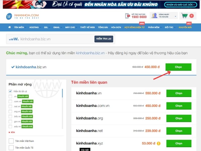 Bước 3: Nhấn "Chọn" vào tên miền đuôi .biz.vn bạn muốn đăng ký.