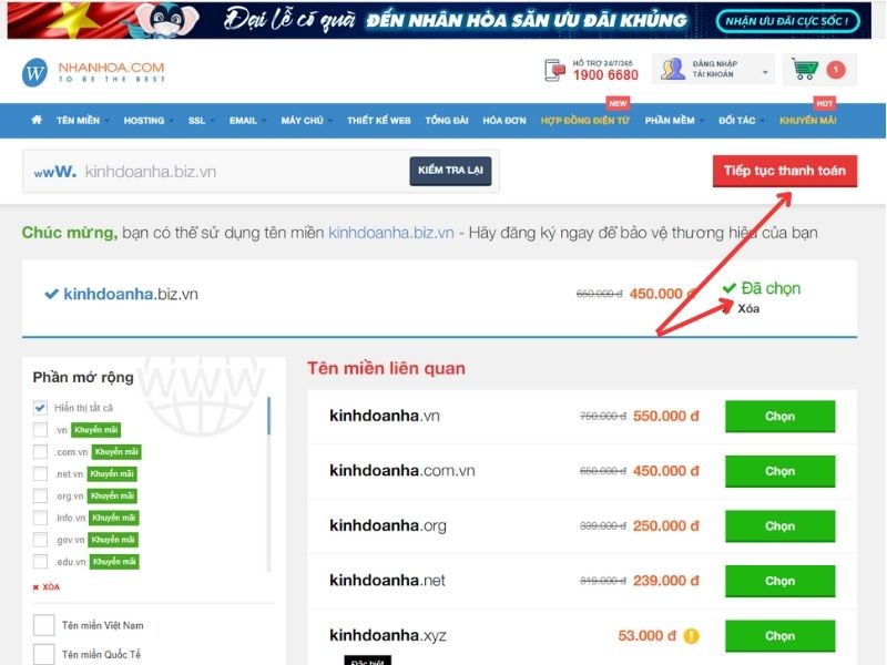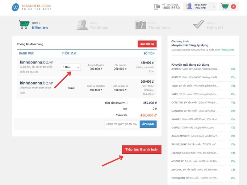 Bước 6: Tại đây chọn thời hạn đăng ký tên miền, sau đó ấn "Tiếp tục thanh toán" là hoàn tất quy trình đăng ký tên miền.