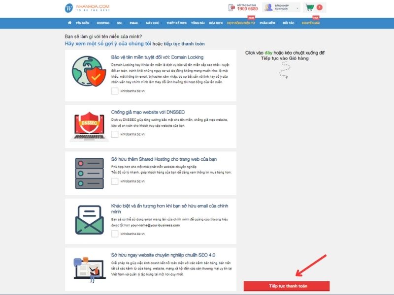 Bước 5: Sẽ có một số tùy chọn gợi ý, nếu có nhu cầu với dịch vụ nào bạn tích vào ô vuông phía dưới. Sau đó nhấn "Tiếp tục thanh toán".